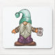 Niedlicher Fall Gnome mit großer Nase und türkisfarbener Hut mit Kaffee-Tasse.