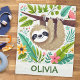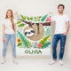 Diese fröhliche personalisierte Fleecedecke besticht durch einen niedlichen Faultier, der von einem Baumzweig auf den Kopf hängt und von farbenfrohen Dschungel-Blätter und tropischen Blume umgeben ist. Das Faultier hat einen freundlichen, kartoonischen Stil.