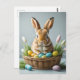 Diese wunderschöne Postkarte zeigt das niedlichste Kaninchen, das in einem Osterkorb mit Eiern ruht. Diese Postkarte wäre ideal für Freunde, Familie und Mitarbeiter.