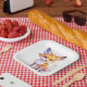 Ein sehr niedliches Set von quadratischen Tellern mit einer Illustration eines lächelnden Babyfuchs.