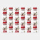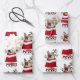 Das wiederholte Muster auf diesen Weihnachtsblättern ist ein Bild eines niedlichen französischen Bulldoggen, der aus einer rot-weißen Weihnachtsgeschenktüte herausguckt. Hinter ihm steht ein Gezeter aus heiligen und roten Beeren. Stilisierter, roter und schwarzer Büffel karierter Text sagt MERRY CHRISTMAS". Der Hintergrund auf zwei der Blätter in diesem Set ist weiß, während das dritte Blatt silber ist.
