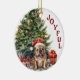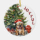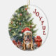 An der Vorderseite dieses Holiday-Ornaments steht das Bild eines bezaubernden französischen Bulldoggen mit einer rot-weißen Weihnachtsmannmütze. Der Hund sitzt vor einem verzierten Holiday-Baum und ist in eine Reihe von festlichen Lichtern eingewickelt. Roter Text an der Seite sagt "JOYFUL". Auf der Rückseite steht rot und grün "MERRY CHRISTMAS", und es gibt zusätzliche Textfelder, die Sie anpassen können. Lass es sagen, was du willst!