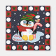 Dieser dekorative Frohe Weihnachtsmagnet hat einen gefliesten Rahmen mit Schneebällen und kleinen Weihnachtsbäumen. In der Mitte befindet sich ein kleiner Pinguin, der einen Candy-Stick mit einem Robin oben hält. Hinter einem dunkelblauen Nachthimmel mit Polka schneidet Schnee. Der Text "Frohe Weihnachten" kann geändert oder entfernt werden.