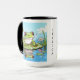 Personalisierte Kaffee-Tasse. Adorable Kröte oder Frosch sitzend auf einem Lilienpolster umgeben von Schmetterlingen mit seiner Reflexion im Wasser. Der Cartoon Frosch im Comic-Stil.