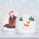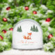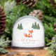 Ein Weihnachtsdesign mit dem Thema Waldtiere. Es gibt einen niedlichen roten Fuchs auf weißem Schnee-Hintergrund, mit Gruppen von grünen Tannen mit Schnee an den Seiten. Der Text "let it snow" ist in roter handgeschriebener Schrift, mit dem Namen und dem Jahr in kleineren grünen Buchstaben darunter.