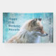 Geburtstagsbanner mit einem Foto eines niedlichen Fuchs, der allein stehend ist. Set auf blauem Grunge Hintergrund.