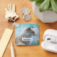 Ein Schlüsselanhänger mit einem Foto eines niedlichen Fuchses, der stehend alleine ist. Set auf blauem Grunge Hintergrund.