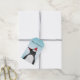 Desteis originelle Cartoon-Illustration eines bezaubernden Gentoo Pinguins mit einer rot-weißen Weihnachtsmannmütze auf blauem Hintergrund. Es gibt auch einen personalisierbaren Textbereich, der jetzt lautet: "Frohe Weihnachten". Auf der anderen Seite gibt es ein zu und von der Box.