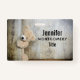 Namensschild mit einem lieblichen Foto eines niedlichen gestopften Bären, stehend von einer rustikalen Holzwand / Kulisse.
