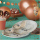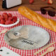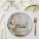 Geburtstagspapier-Teller mit einem lieblichen Foto eines niedlichen, gestopften Bären, stehend von einer rustikalen Holzwand / Kulisse.