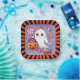 Adorable, unheimliche Halloween-Design mit dem niedlichsten Geist, der einen roten und weißen Lolly neben einem leckeren Kürbis mit bunten Süßigkeiten hält. Umgeben von fröhlichen Süßigkeiten und dem Wort BOO! in orangefarbenen Buchstaben am unteren rechten Bildrand.