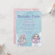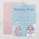 Diese lustige und festliche Geburtstagsfeier-Einladung bietet ein Winterthema. Im Hintergrund zeichnet sich hübsch fallender Schnee ab, in den unteren Ecken bilden sich schneebedeckte Hügel. Zwei niedliche Puppen mit bunten Haaren sind unter den Schneeflocken stehend und halten verschiedene Feiertage oder Weihnachtsartikel. Das Mädchen auf der links hält einen Süßwarenstock und Lollipop und das rechts hält verschiedene Ornamente. Imitate Glitzer Glitzern akzentuieren die Puppen und Schnee.