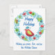 Dieses kennzeichnet die glücklichen Feiertage Postkarte grüßend einen bunten Blume Wreath mit einem niedlichen roten Vogel, der einen Winterhut trägt.
