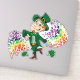 Vinyl Sticker mit der Illustration eines niedlichen, fröhlichen Lekoboboldes, trägt einen grünen Anzug und einen Tophut und ist umgeben von regenbogenfarbenen Splash. Ein perfektes Design zum St. Patrick's Day, gezeichnet von Radka2D