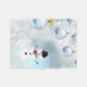 Niedliche Weihnachtsbälle, Schneeflocken und glücklicher Schneemann auf glitzerndem grauen Hintergrund.