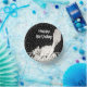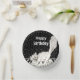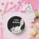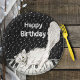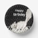 Diese Papierschale hat ein Schwarz-Weiß-Bild einer glücklichen weißen Katze, die über Klaviertasten läuft und im Hintergrund Musiknoten hat. Passen Sie den Geburtstagstext von Happy mit der Vorlage an.