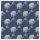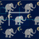 Dieses schöne Gewebe kennzeichnet ein niedliches Muster der grauen kleinen Elefanten mit einem playfully angehobenen Stamm und einem Fuß auf Mitternachtsblau und wechselt mit goldenen gelben Sternen und Monden ab.