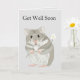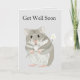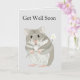 Diese bearbeitbare "Get Well Balon" Karte verfügt über einen niedlichen Hand gezeichnet grauen und weißen Hamster, halten eine Blume vor einem weißen Hintergrund.