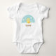 Ein niedlicher Baby-Strampler, der mit einem gelben Gummifilet ausgeliefert wird, welches ein sehr gutes altes Lieblingsbadespielzeug für Kleinkinder ist, die duschen. Fun Blasen schweben im Hintergrund. Personalisieren Sie einfach den Namen des Kindes. Der blaue Hintergrund macht es zu einem perfekten Geschenk für Neugeborene und Kleinkinder mit ihrer Babydusche oder ihrem ersten Geburtstag.