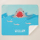 Diese niedliche Hai-Fleecedecke ist ein personalisiertes Geschenk für jedes Kind. Das Design ist mit einem großen Mund und Zähnen aus Hai, die durch Wasserwellen und kleinere Haie hervorgehoben werden.