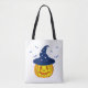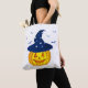 Niedliche Halloween Kürbiskürbis mit einem Hexenhut gefüllt mit weißen Sternen, Blue Bats Tote Tasche. Orange Glitzern Striped Trick oder Treat Script auf der Rückseite.