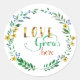 Handgezeichneter Blumenkranz in Aquarellfarben mit gelben Farbtönen und kleinen blauen Blumen und Blätter mit der Meldung "Liebe wächst hier", perfekt für Produktaufkleber, Aufkleber für Gastgeschenk Hochzeiten, Aufkleber für Brautpartys, Aufkleber für die Schwangerschaftsankündigung, Babygeburtstagsticker