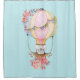 Ein Duschvorhang mit einem hübschen Design mit Aquarellbildern. Ein Heißluftballon mit hübschen roten und rosa Blume. Ein niedlicher kleiner, weißer Bär sitzt im Korb. Hellblauer Hintergrund.
