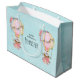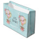 Große Geschenktasche mit einem ansprechenden Design mit Aquarellbild. Ein Heißluftballon mit hübschen roten und rosa Blume. Ein niedlicher kleiner, weißer Bär sitzt im Korb. Hellblauer Hintergrund.