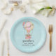 Babydusche (oder andere Veranstaltung) Teller mit einem ansprechenden Design mit Aquarellbild. Ein Heißluftballon mit hübschen roten und rosa Blume. Ein niedlicher kleiner, weißer Bär sitzt im Korb. Vintager Stil hellblauer Hintergrund.
