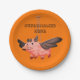 Ein niedliches, ausgestopftes Schweine, das in einem KrähenkKostüm gekleidet ist, scheint zu fliegen. Das Schwein ist rosa und in einem gelben Schnabel und schwarzen Federflügel gekleidet. Der Teller ist in Orange und Schwarz gefertigt und kann personalisiert werden. Sehr niedlich.