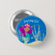 Niedliche Geburtstagsknöpfe von Meerjungfrau mit einem hübschen lila Hispanic-Mädchen und einem coolen aquamarinen Schwanz, das neben schönen Muscheln im Ozean schwimmt. Coole Sommertaste für ein Party oder ein Strandmädchen.