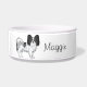 Niedlicher Hund aus schwarz-weißem Papillon mit be Napf
