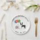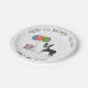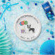Niedliche Geburtstag Design mit Desteis origineller Cartoon-Illustration einer niedlichen Schwarz-Weiß-Farbe Boston Terrier Rasse Hund. Neben dem Hund gibt es bunte Geburtstagsballons, die an einem Hundeknochen befestigt sind, und eine lila, gelbe Geschenkbox. Der Hintergrund hat ein spielerisches Muster von bunten Pastellfischen auf weißem Hintergrund. Es gibt auch zwei personalisierbare Textbereiche.