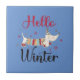 Eine niedliche Eis Skaten Hund Illustration und die Worte: Hallo Winter.