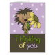 Niedlicher kleiner Igel mit einer großen gelben Blume auf lila, spottischem Hintergrund, über den Wörtern "Denken Sie an Sie" Karten von Ricaso cu Lizenz von ScrappinDoodles