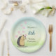 Ein niedlicher Igel, der mit Seifenblasen in Form von rosa Herzen spielt. Adorable Tier personifizierte Mädchen Geburtstagspapier Teller.