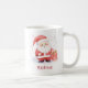 Kaffee-Tasse mit einer Abbildung eines niedlichen Weihnachtsmannes, der eine Geschenkboxen mit Ihrem Namen in einem roten, skurrilen Schriftart unten hält.