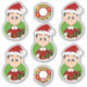 Set von sieben Vinyl-Aufklebern mit einer Illustration eines niedlichen kleinen, glücklichen Lächeljungen mit kurzem schwarzem Haar, der in Weihnachtskleider gekleidet ist und einen roten Weihnachtshut auf grünem Hintergrund trägt; fünf Aufkleber des Jungen und zwei Aufkleber mit einem Weihnachtskranz