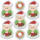 Set von sieben Vinyl-Aufklebern mit einer Illustration eines niedlichen kleinen, glücklichen Lächeljungen mit kurzem blondem Haar, der in Weihnachtskleider gekleidet ist und einen roten Weihnachtshut auf grünem Hintergrund trägt; fünf Aufkleber des Jungen und zwei Aufkleber mit einem Weihnachtskranz; mit einer anpassbaren Textvorlage für Ihren Namen oder Ihre Nachricht.