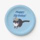 Die niedliche Malerei einer Schwarzweiss-Tuxedokatze im Pointillism, einen Partyhut mit Ballonen auf ihr tragend, wird auf kundenspezifischem PapierTeller gedruckt. Der Text sagt, dass "alles Gute zum Geburtstag" und er leicht besonders angefertigt werden können, um Ihre Gelegenheit zu passen.