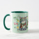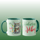 Zwei-Töne grüner Kaffee / Tee / heiße Schokolade Tasse Geschenk Idee für Weihnachten. Mit einem niedlichen Kater, Liebe Herz und Baubel, mit den Worten "Holiday Vibes". Die Hauptfarben sind grün und rot auf einem hellgrünen Hintergrund.