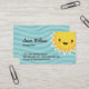 Niedliche Babysitter-Visitenkarten, die eine glückliche kawaii Artsonne auf einem aquamarinen oder Aquahintergrund mit gewellten Streifen kennzeichnen. Heller und Spaßentwurf. Für kundenspezifische Anträge oder Hilfe bei bitte besonders anfertigen verwenden Sie die Speicherkontaktverbindung oben.