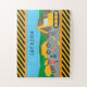 Got ein kleiner Junge, der Lieben, Fahrzeuge zu bauen? Dieses Puzzle ist perfekt! Das Puzzle hat einen Müllwagen, einen Zementwagen und einen Bagger, die alle an einer Straßenbaustelle zusammenarbeiten. Ein kleiner Junge steht vorne mit einem Stoppschild, um den Verkehr zu stoppen. Es gibt auch orangefarbene Sicherheitskegel, Hintergebirge und blauen Himmel. Beende das Rätsel mit dem Vornamen deines jungen Mannes.
