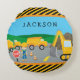 Got ein kleiner Junge, der Lieben, Fahrzeuge zu bauen? Dieses Kissen ist perfekt! Das Kissen verfügt über einen Müllwagen, einen Zementwagen und einen Bagger, die alle an einer Straßenbaustelle zusammenarbeiten. Ein kleiner Junge steht vorne mit einem Stoppschild, um den Verkehr zu stoppen. Es gibt auch orangefarbene Sicherheitskegel, Hintergebirge und blauen Himmel. Beende das Kissen mit dem Vornamen deines jungen Mannes.