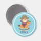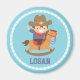 Magnet mit einem Cartoon eines niedlichen glücklichen kleinen Jungen kleidete in der Westerncowboyausstattung an, die mit Hut komplett ist, der einen Sheriffstern hat. Er fährt auf ein Schaukelpferdspielzeug. Groß als Minigeschenk für Jungen die Liebe-Western-Cowboythemen! Personifizieren Sie mit dem Namen des Kindes.