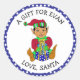 Eine schöne Art, jemanden lassen, der weiß, wer das Geschenk ist, wer ist! Ein kleiner, süßer Junge, der farbenfroh auf der Weihnachtsspieltasche des Weihnachtsmanns sitzt. Von und zu den Aufklebern für Weihnachtsgeschenke.