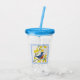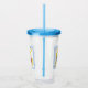 Dieser Acryl-Drink-Krüger mit Stroh und Deckel hat einen niedlichen kleinen roten und blauen Vogel, der auf einem Zweig mit hellgelben Blumen in einem extravagant hellblauen Rahmen sitzt.