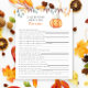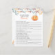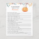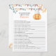"Ein kleiner Kürbis ist unterwegs. Feiern Sie mit diesem Baby Cartoon Kürbis Thema für Baby Dusche Party! Wasserfarbener niedlicher Cartoon Kawaii Kürbis mit Herbstmütze (Kappe) und Herbstlauben. Auf der Rückseite der Karte befinden sich Herbstblätter.