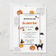 Dies ist niedlich Boo Halloween Illustrationen Kinder Party perfekte Halloween-Party Einladungskarte auf pastellrot rot pink. Diese Einladungskarte bietet Gespenster, Kürbis, Katzen, Spinnennetze, Hexenhüte, Besen, Spinnen und Fledermäuse.