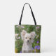 Ein junges, langhaariger, weißer Chihuahua-Hund, der in einem blühenden Garten sitzt, Foto von Katho Menden. Diese Tasche ist eine Geschenkidee für Hundeliebhaber: http://www.zazzle.com/kathom_photo Wenn Sie ein Design sehen, das nicht auf Ihrem gewünschten Produkt erhältlich ist, zögern Sie bitte nicht, mich über meinen Shop zu kontaktieren und ich werde Ihnen gerne das Produkt für Sie erstellen.